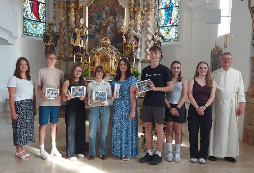 Beim Sonntagsgottesdienst sind in der Pfarrei Neukirchen sieben neue Ministranten feierlich in ihr Amt eingeführt und am Vortag sechs ausscheidenden Ministranten verabschiedet worden. Zu Beginn der Messe ging Pater Simeon auf die Bedeutung und die Vielfalt des liturgischen Dienstes ein, hier stellte er besonders die Aufgaben der Messdiener heraus. Nachdem die neuen Ministranten gelobten, ihren Dienst zuverlässig auszuführen, dankte Pater Simeon diesen für ihre Bereitschaft, einen wichtigen und ehrenvollen Beitrag zur Gestaltung des Gottesdienstes leisten zu wollen. Die neuen Messdiener sind: Jana Amberger, Leonhard Baumgartner, Simon Grüll, Lisbeth Obermeier, Paul Schießl, Emma Schwarzensteiner und Noah Wieser. Diese durften in einer Gabenprozession den Altar für die Eucharistiefeier bereiten. Tags zuvor verabschiedete und bedankte sich der Pfarrer bei Amelie Bräu, Marie Hastreiter (Oberministrantin), Eileen Huber, Pauline Rinkl, Michael Wirth und Roman Zimmerer für ihren jahrelangen treuen Dienst mit einem Erinnerungsgeschenk. Bild: Pater Simeon begrüßte im Namen der Pfarrgemeinde die sieben neuen Messdiener (erste Reihe). Text/Bild: Matthias Wallner